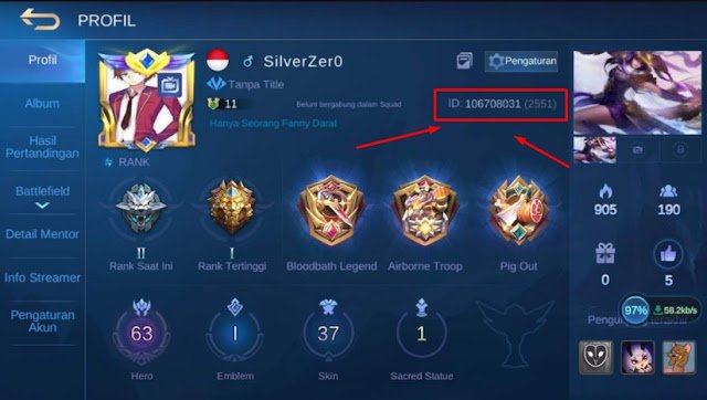 Seperti biasa untuk mengakses suatu toko online untuk melakukan top up diamond ml kita harus mengungat atau mengetahui ID dan server Mobile Legends kita agar nantinya diamond benar-benar dikirim ke id akun kamu. Nomor seri yang bisa kamu lihat untuk mengisi diamond adalah dengan cara klik profile kamu dan anti akan ada id dan server id Mobile Legends kamu sebagai contoh lihat gambar dibawah ini :