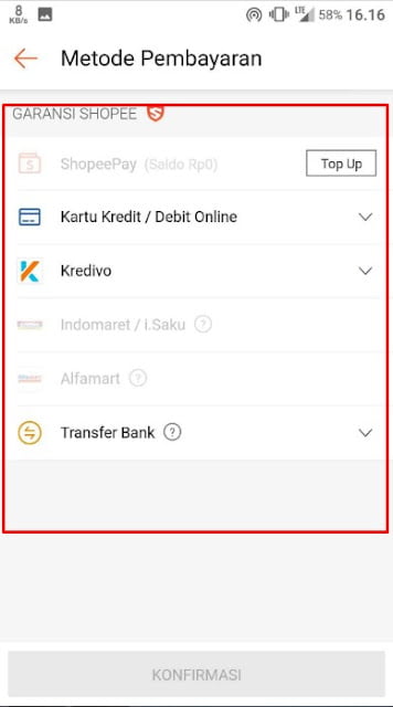 5. Lalu nanti kamu Tap Lanjut dan akan langsung menuju ke metode pembayaran yang akan dipilih, Terserah anda mau bayar pakai metede yang mana dan metode pembayaran yang tersedia di shopee adalah lihat gambar dibawah ini