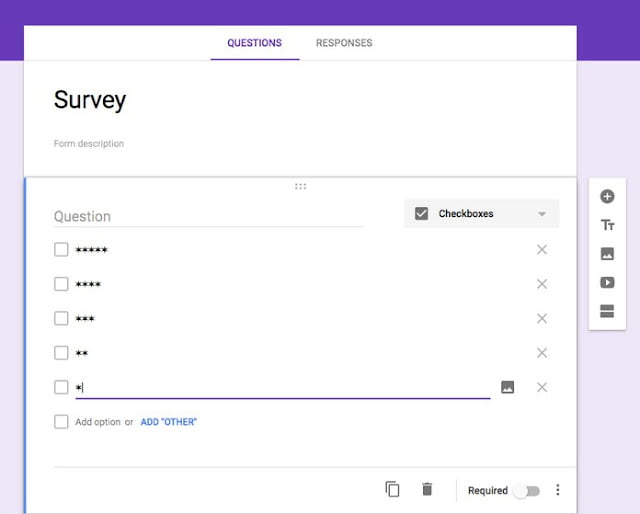 Google Forms mempunyai fitur di bidang teks, foto dan video. Cukup klik ikon pada sidebar di bagian kanan untuk menambahkan pertanyaan yang baru, untuk ikon teks, foto dan video kamu menambahkannya lewat media ke formulir kamu.