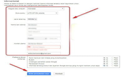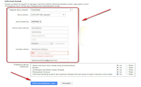 Selanjutnya jangan lupa masukan Nama penerima pembayaran dan alamat email lengkap. Ini adalah bagian yang sangat penting di harapkan Alamat sesuai idnentitas sesuai dengan alamat KTP kamu kalo bisa mah Setelah beres semua silahkan Klik Selesai dan kirim Permohonan untuk daftar akun adsense.