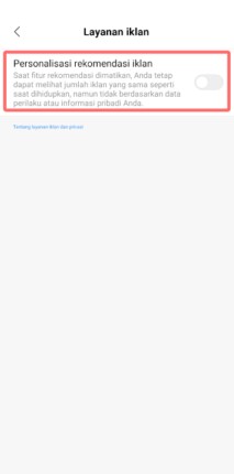 Kamu bisa menonaktifkan Rekomendasi Personalisasi Iklan yang berada di Pengaturan Privasi di hp kamu dan buka menu berikut ini.