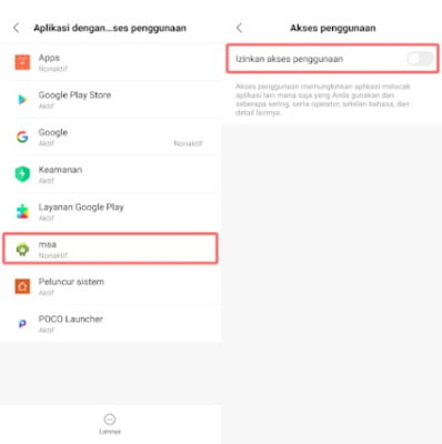 - Lalu matikan izin akses aplikasi msa Aplikasi dengan akses penggunaan (Apps with usage accesss)