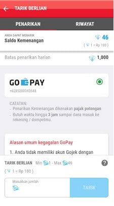 5. Jika kamu sudah bermain cukup lama dan mendapatkan banyak diamon silahkan kamu tukar penarikan diamon ke GOPAY dengan cara ada di menu saku pojok kanan bawah dan masukan jumlah saldo yang ingin di tarik ke gopay.