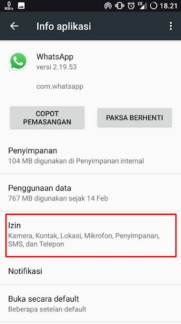 3.Kemudian kamu cari aplikasi whatsap dan klik lalu kamu masuk ke menu Perizinan