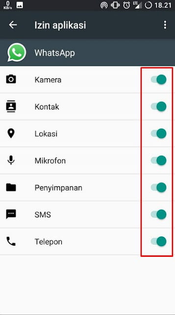 4. Jika sudah di dalam menu perizinan kamu tinggal mengaktifkan semua alias memberi izin pada aplikasi atas hak akses camera audio dan lain lain