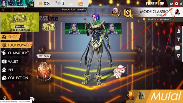 1. Buka Free Fire kamu. Lalu klik tombol Gear di pojok kanan atas untuk masuk ke menu Pengaturan.