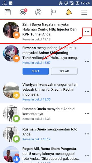 3. Lalu cari Notifikasi yang ada di fanspage kamu Lalu klik titik 3 yang ada di samping pemberitahuan fanspage kamu