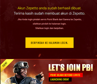 - Ketika selesai mendaftar anda akan diarahkan ke halaman Akun Zepetto anda sudah berhasil dibuat. Disini anda tinggal klik Berpindah Ke Halaman Login.