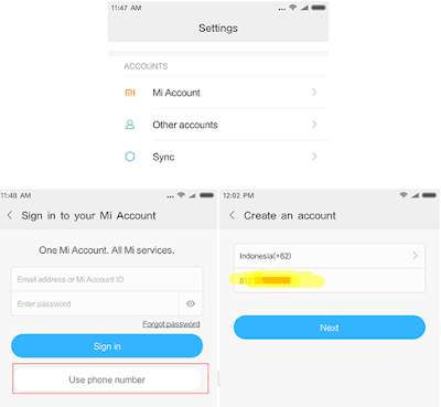 • Anda harus mempunyai Mi Account. Anda bisa registrasi melalui web atau pada perangkat Xiaomi Anda menggunakan nomor handphone atau email. Saya lebih menyarankan menggunakan Nomor Handphone. Caranya, masuk ke menu Setting-Mi Account, pilih Create an account kemudian isi form yang tersedia hingga proses pembuatan Mi Account selesai lalu loginkan langsung di perangat xiaomi anda yang sekarang di pakai.