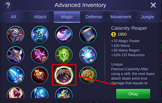 .Item ini memberikan tambahan 70 Magic Power, 100 mana, 30 mana regen, dan 10% CDR. Semua atribut yang sangat dibutuhkan Harith, terutama di early game. Harganya yang terbilang murah pun membuat item ini dapat jadi lebih cepat ketimbang item lain. Calamity Reaper adalah kuncian buat Hero Harith. Tambahan atribut serta