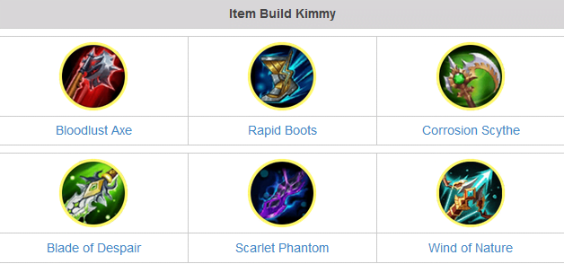 Bloodlust Axe memberikan damage besar dan Spellvamp yang sangat cocok dengan skillset Kimmy yang dapat dikatakan bisa dispam kapan saja, terutama dengan jumlah hit dari Skill 1nya sebelum kehabisan energi.