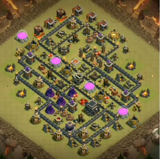 Karena tujuan dari base seperti ini adalah mengumpulkan jumlah Trophy sebanyak mungkin. Untuk gambar Base CoC TH9 tipe trophy bisa sobat lihat dibawah ini.