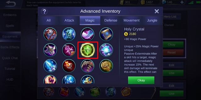 Holy Crystal sanggup memberikan tambahan magic power sebesar 90 poin, juga gear ini memberikan efek pasif berupa Extriminate yang memberikan tambahan 15 persen magic poin pada saat skill berhasil mengenai lawan. Juga tambahan pasif berupa 25 persen magic power.