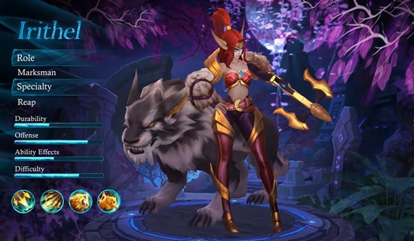Irithel juga menjadi marksman yang memiliki damage besar. Skill ultimate miliknya yaitu Heavy Crossbow akan meningkatkan damage dari Irithel serta meningkatkan kecepatan serangannya. Dengan tambahan battle spell Inspire, Irithel bisa menembakkan panahnya dengan sangat cepat serta mematikan.