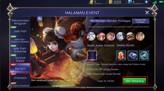 5. Jika sudah terdaftar, silahkan kalian buka game Mobile Legends kalian kemudian pilih Starlight. Silahkan kalian tekan tombol Beli Sekarang.