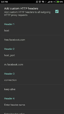 5. Kemudian ceklis Add custom HTTP headers lalu masukan URL bug kuota chat dan social media di bagian header 1 sampai 3. Lihat dibawah ini :