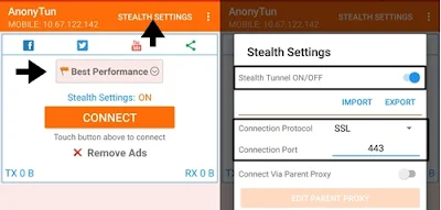 3. Pada halaman awal, untuk server VPN pilih Best Performance saja, selanjutnya tap tombol Stealth Settings kemudian atur seperti dibawah ini.