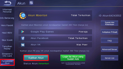 Nah oleh karena itu setidaknya kita harus menautkan Mobile Legends kita dengan satu akun agar aman, atau bisa ditautkan semuanya agar lebih aman lagi. Untuk menautkan Mobile Legends dengan akun yang sudah ada, bisa menggunakan 4 akun seperti yang sudah disebutkan diatas. Salah satunya adalah akun Moonton. Berbeda dengan akun lain, akun Moonton memang secara khusus disedikan oleh Moonton sekalu developers Mobile Legends guna player bisa mengamankan akun mereka.