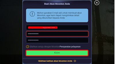 3. Selanjutnya akan muncul form pendaftaran akun Moonton, untuk cara pendaftaraanya cukup mudah tinggal masukkan email yang masih aktif, masukkan password (harus 6 karakter atau lebih, dan password harus mengandung huruf besar, kecil dan angka), masukan ulang password, setujui persyaratan. Jika sudah semuanya tinggal “Kirim”.
