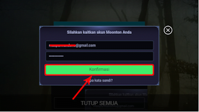 6. Selanjutnya tinggal tautkan atau login akun Moonton ke Mobile Legends, untuk caranya pilih menu “Silahkan kaitkan akun Moonton Anda” dibawah form pendaftaran seperti gambar di langkah no 3. Disitu tinggal masukkan gmail akun Moonton Anda dan password, jika sudah klik Konfirmasi.