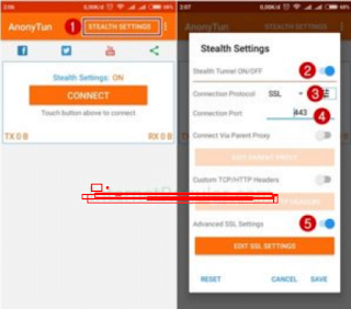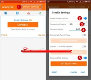 2. Pada halaman awal pilih menu Stealth Setting, kemudian aktifkan Stealth Tunnel VPN > Connection Protocol : ubah ke SSL > Connection Port : masukan 443 > Advanced SSL : Aktifkan. Lihat SSH dibawah ini agar lebih jelas.