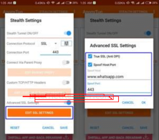 3. Tap tombol EDIT SSL SETTING yang berada di bagian paling bawah. Lalu ceklis semua True SSL (Anti DPI) dan Spoof Host:Port.