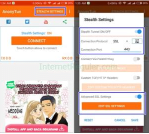 2. Pada halaman awal pilih menu Stealth Setting, kemudian aktifkan Stealth Tunnel VPN > Connection Protocol : ubah ke SSL > Connection Port : masukan 443 > Advanced SSL : Aktifkan. Lihat SSH dibawah ini agar lebih jelas.