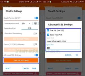 3. Tap tombol EDIT SSL SETTING yang berada di bagian paling bawah. Lalu ceklis semua True SSL (Anti DPI) dan Spoof Host:Port.