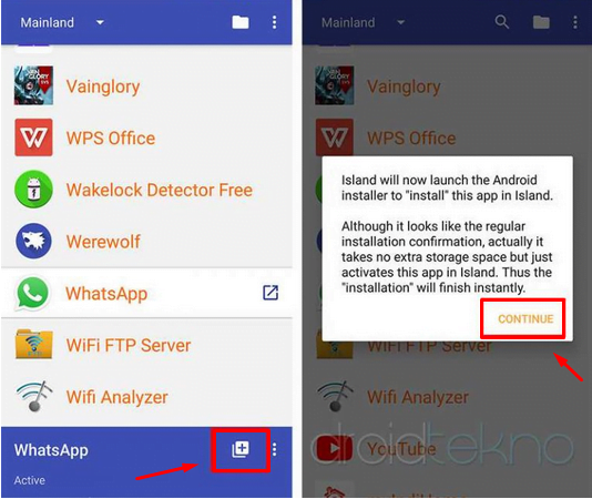 Cara pakainya sendiri sangat gampang, kita tinggal masuk ke menu “Mainland” lalu pilih aplikasi mana yang mau di Cloning atau di duplikat dan selanjutnya klik tombol “+” kemudian lanjut klik “Continue“, dan nanti ada muncul semacam konfirmasi instalasi apk seperti biasanya tapi proses ini gak memakan storage sama sekali, jadi aman buat yang storage atau penyimpanan hapenya kecil.