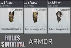 Armor atau pelindung tubuh seperti rompi anti peluru, Level sama halnnya dengan tas memiliki 3 , Lv.1 Lv.2 dan Lv.3, semakin besar level armor pastinya semakin besar juga defend karakter kamu.