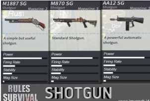 Ada 3 Jenis Shotgun di sini ada yang hanya berkapasitas 2 peluru saja M1887 SG, dan berkapasitas 5 peluru tetapi sekali kokang M870 SG, dan 5 peluru tanpa kokang AA12 SG.