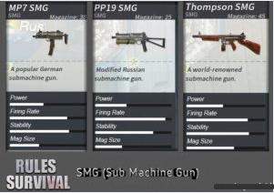 Ada 3 Jenis senjata SMG, MP7 SMG , PP19 SMG, Thompson SMG. Dan setiap jenisnya memiliki kelebihan dan kekurangan masing-masing.