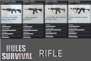 Ada 4 macam Rifle di Rules of Survival yaitu : M14EBR RIFLE, M4A1 Rifle, AR15 Rifle, dan AKM Rifle. Setiap senjata memiliki kelebihan dan kekurangan masing-masing.