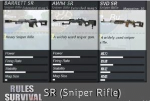 - SVD : SVD merupakan senjata jenis SR terbaru, dan baru saja di tambahkan di update terakhir. SVG berbeda dengan AWM karena memiliki kapasitas ammo yang lebih banyak, dan saat menembak tidak keluar dari mode Scope, jadi kamu bisa menembak secara langsung berkali-kali.