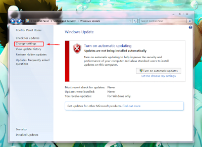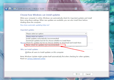 5. Untuk mematikan windows update 7, silakan pilih Never check for updates (not recommended). Kemudian pilih OK.