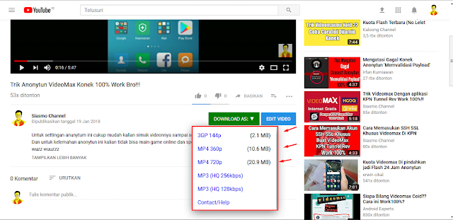 - Klik tombol Download As dibawah channel video, lalu pilih format video yang anda inginkan. Tinggal pilih Download As