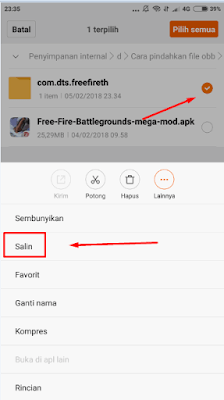 - Selanjutnya kalian tekan dan tahan pada folder OBB nya sampai muncul pilihan dan silahkan pilih Copy atau salin.