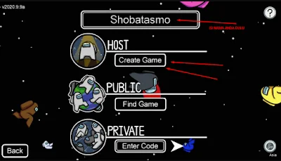 1. Pertama kamu buka game among us dan nanti tampilannnya kurang lebih akan seperti ini. Dan kamu harus ini dulu nickname kamu dan setelah itu silahkan klik create game agar nanti kamu membuat room dan bisa mabar bersama teman anda di game among us.