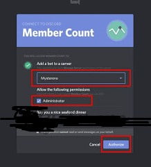 Nanti kalian ad bot ke server saja dan pilih server mana yang akan kamu masukan bot ini. Seperti contoh di atas adalah server discord saya, setelah memasukan ke server jangan lupa di bagian Administrator biar botnya bisa memanage channel server discord. Administrator memiliki perintah bisa mengatur bot supaya botnya bisa menampiljan server satats discord kamu.